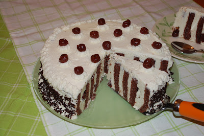 Am cautat sa pregatesc un tort mai masculin, desi B cauta gustul nu aspectul si sigur nu l-ar fi deranjat ceva rozaliu, cu fructe. Prin urmare a fost momentul propice sa incerc tortul spirala, cu blat de cacao, gen amandina, crema de branza (preferata tuturor ai casei, inclusiv a lui B). Un plus de gust a fost adus de visinele din visinata, salvate in ultimul moment acum 2 luni, de la inutilitate si un drum numai dus, la Glina. Atunci le-am luat de la Maia, le-am portionat si congelat, abia asteptand o ocazie de a le folosi in ceva dulce, iar acum au completat foarte bine tortul, cu aroma si taria lor.
